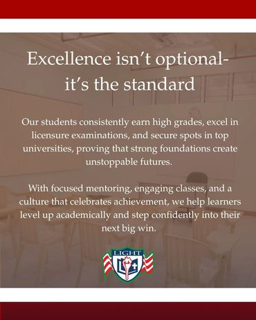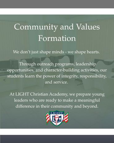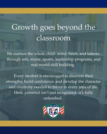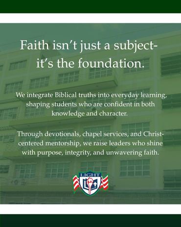 𝗔𝘁 𝗟𝗜𝗚𝗛𝗧, 𝘄𝗲 𝗯𝗲𝗹𝗶𝗲𝘃𝗲 𝗲𝗱𝘂𝗰𝗮𝘁𝗶𝗼𝗻 𝗶𝘀 𝗮𝗯𝗼𝘂𝘁 𝗳𝗮𝗿 𝗺𝗼𝗿𝗲 𝘁𝗵𝗮𝗻 𝗮𝗰𝗮𝗱𝗲𝗺𝗶𝗰𝘀 𝗮𝗹𝗼𝗻𝗲; 𝗶𝘁 𝗶𝘀 𝗮𝗯𝗼𝘂𝘁 𝗻𝘂𝗿𝘁𝘂𝗿𝗶𝗻𝗴 𝘁𝗵𝗲 𝘄𝗵𝗼𝗹𝗲 𝗰𝗵𝗶𝗹𝗱 𝗮𝗻𝗱 𝗯𝘂𝗶𝗹𝗱𝗶𝗻𝗴 𝗮 𝗳𝗼𝘂𝗻𝗱𝗮𝘁𝗶𝗼𝗻 𝘁𝗵𝗮𝘁 𝗹𝗮𝘀𝘁𝘀 𝗮 𝗹𝗶𝗳𝗲𝘁𝗶𝗺𝗲. 𝗪𝗲 𝗮𝗿𝗲 𝗰𝗼𝗺𝗺𝗶𝘁𝘁𝗲𝗱 𝘁𝗼 𝗮𝗰𝗮𝗱𝗲𝗺𝗶𝗰 𝗲𝘅𝗰𝗲𝗹𝗹𝗲𝗻𝗰𝗲, 𝗰𝘂𝗹𝘁𝗶𝘃𝗮𝘁𝗶𝗻𝗴 𝗰𝘂𝗿𝗶𝗼𝘀𝗶𝘁𝘆, 𝗰𝗿𝗶𝘁𝗶𝗰𝗮𝗹 𝘁𝗵𝗶𝗻𝗸𝗶𝗻𝗴, 𝗮𝗻𝗱 𝗮 𝗹𝗶𝗳𝗲𝗹𝗼𝗻𝗴 𝗹𝗼𝘃𝗲 𝗼𝗳 𝗹𝗲𝗮𝗿𝗻𝗶𝗻𝗴. 𝗔𝘁 𝘁𝗵𝗲 𝘀𝗮𝗺𝗲 𝘁𝗶𝗺𝗲, 𝘄𝗲 𝗶𝗻𝘁𝗲𝗻𝘁𝗶𝗼𝗻𝗮𝗹𝗹𝘆 𝗶𝗻𝘃𝗲𝘀𝘁 𝗶𝗻 𝘄𝗲𝗹𝗹-𝗿𝗼𝘂𝗻𝗱𝗲𝗱 𝗱𝗲𝘃𝗲𝗹𝗼𝗽𝗺𝗲𝗻𝘁- 𝗲𝗻𝗰𝗼𝘂𝗿𝗮𝗴𝗶𝗻𝗴 𝗹𝗲𝗮𝗱𝗲𝗿𝘀𝗵𝗶𝗽, 𝗰𝗿𝗲𝗮𝘁𝗶𝘃𝗶𝘁𝘆, 𝘀𝗲𝗿𝘃𝗶𝗰𝗲, 𝗮𝗻𝗱 𝗺𝗲𝗮𝗻𝗶𝗻𝗴𝗳𝘂𝗹 𝗰𝗼𝗺𝗺𝘂𝗻𝗶𝘁𝘆 𝗶𝗻𝘃𝗼𝗹𝘃𝗲𝗺𝗲𝗻𝘁. 𝗚𝗿𝗼𝘂𝗻𝗱𝗲𝗱 𝗶𝗻 𝗮𝘂𝘁𝗵𝗲𝗻𝘁𝗶𝗰 𝗕𝗶𝗯𝗹𝗶𝗰𝗮𝗹 𝗽𝗿𝗶𝗻𝗰𝗶𝗽𝗹𝗲𝘀, 𝘄𝗲 𝘀𝘁𝗿𝗶𝘃𝗲 𝘁𝗼 𝗶𝗻𝘀𝘁𝗶𝗹𝗹 𝘁𝗵𝗲 𝗰𝗼𝗿𝗲 𝘃𝗮𝗹𝘂𝗲𝘀 𝘁𝗵𝗮𝘁 𝘀𝗵𝗮𝗽𝗲 𝘀𝘁𝗿𝗼𝗻𝗴 𝗰𝗵𝗮𝗿𝗮𝗰𝘁𝗲𝗿, 𝗶𝗻𝘁𝗲𝗴𝗿𝗶𝘁𝘆, 𝗮𝗻𝗱 𝗰𝗼𝗺𝗽𝗮𝘀𝘀𝗶𝗼𝗻.